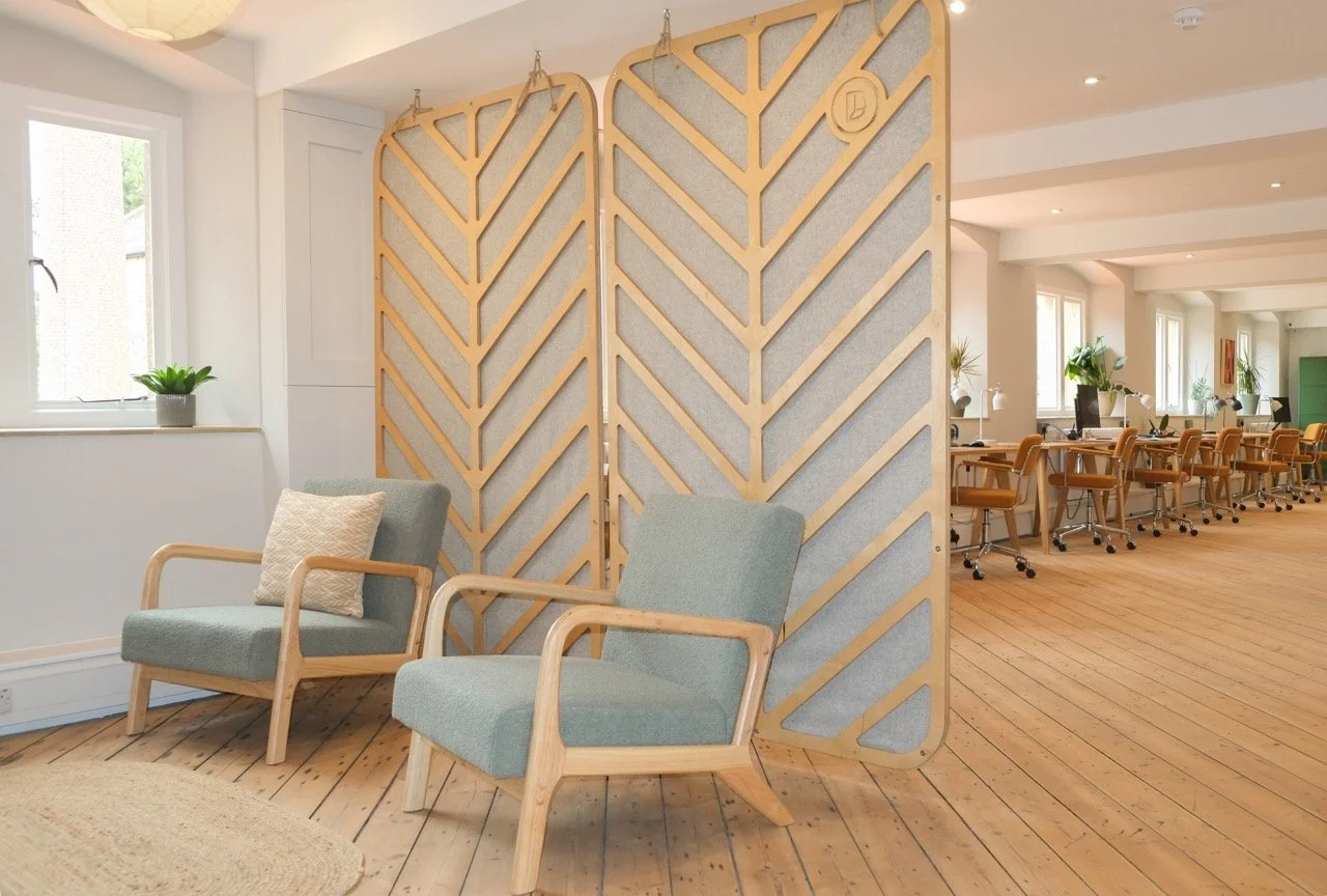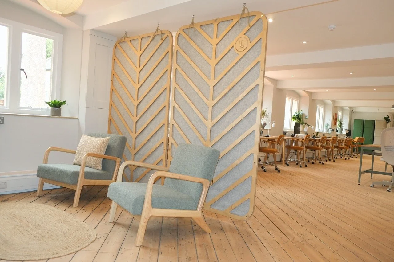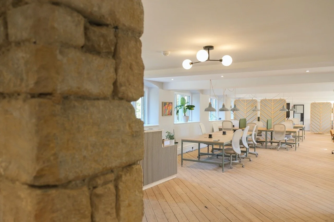 Based in a former mill, our main room is filled with natural light from both sides, has a beautifully restored wooden floor and overlooks the new courtyard and café.