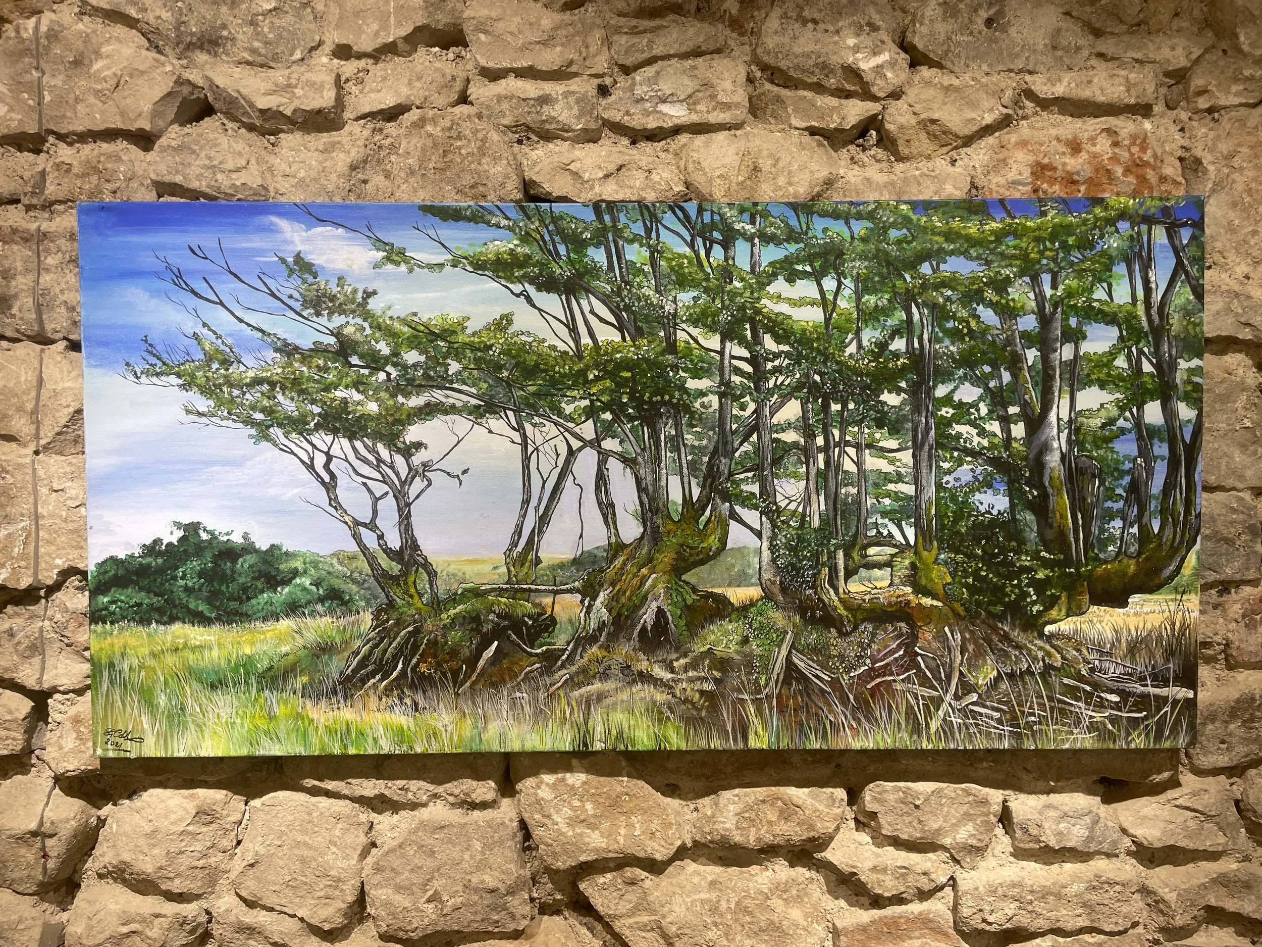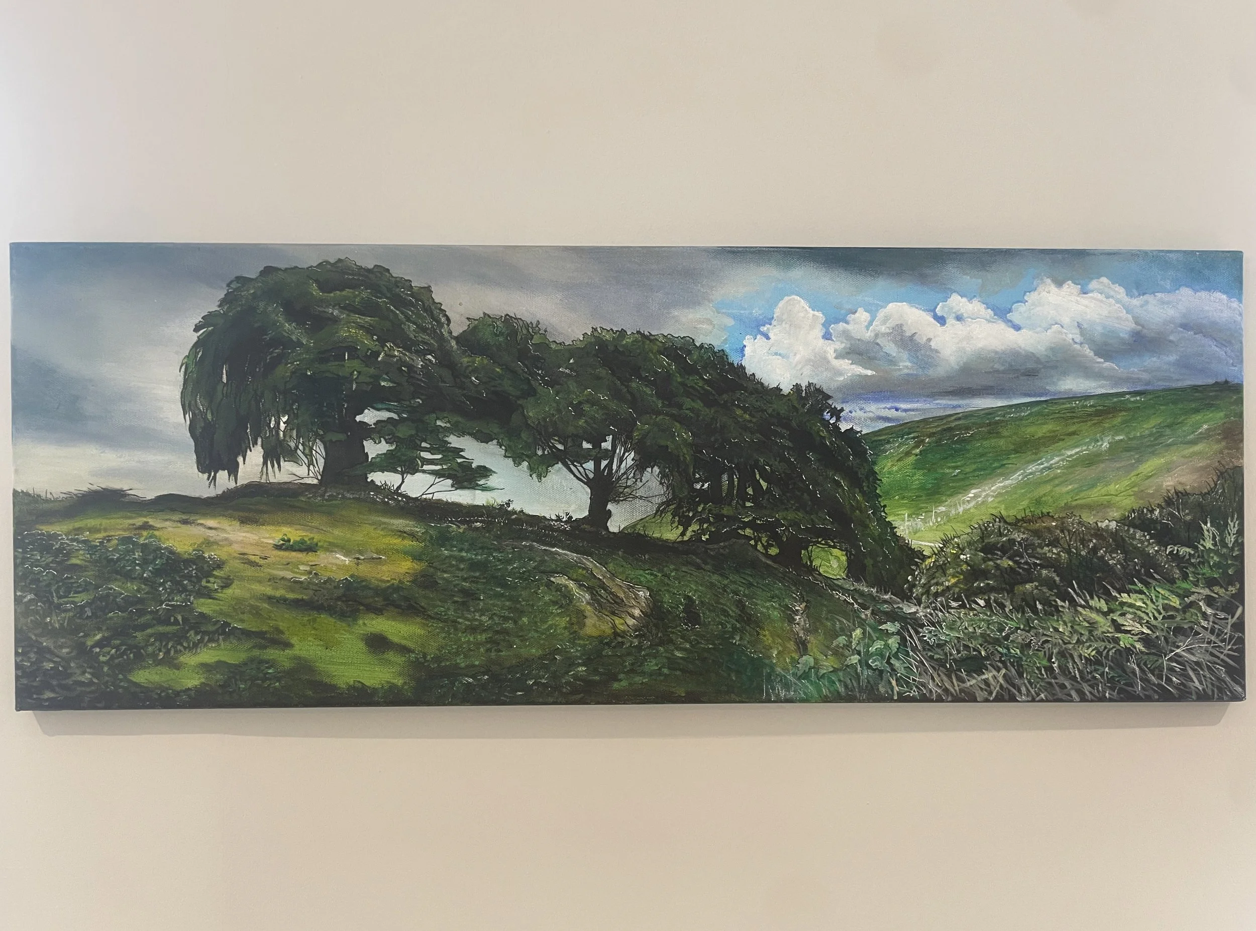 A self-taught painter whose “stairway to heaven” studio sits at the top of her home, Trisha Mason creates upbeat landscapes and seascapes with generous colour and energy. After decades of life and work leaving little room for painting, she returned to it with joy; she now paints and creates with love and energy, portraying the happiness that she feels when out in the countryside or by the sea.